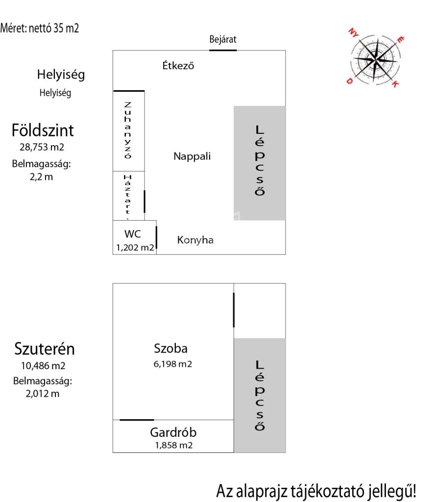 Az ingatlan két szintes, a felső szint 28,753 m2, és alatta található még egy szuterén (10,486 m2) helyiség, megosztva, jelenleg szoba és egy gardrób.