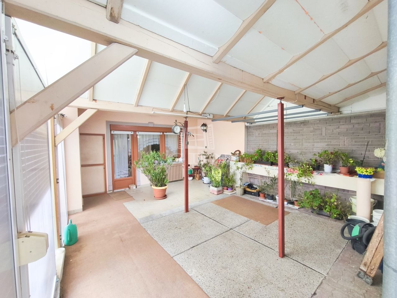 Az udvar rendezett, füvesített, gyümölcsfákkal, veteményeskerttel és egy térkövezett pavilonnal.