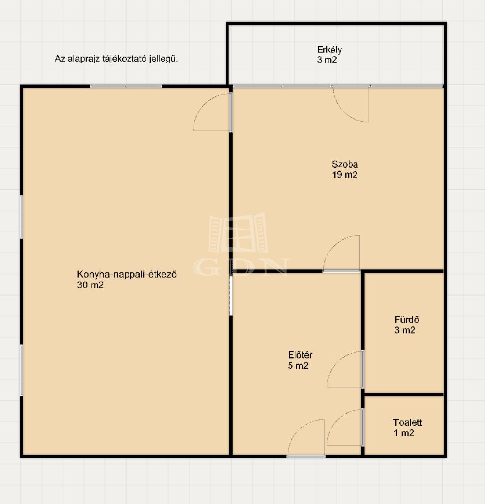 Az 58 m2 - es ingatlan helyet ad egy előtér - folyosónak, egy mindig világos, benapozott 30 m2 - es konyha nappali együttesnek, egy külön nyíló hálószobának, mely erkélykapcsolatos, egy zuhanyzóval felszerelt fürdőnek, valamit egy külön helyiségben található toalettnek.